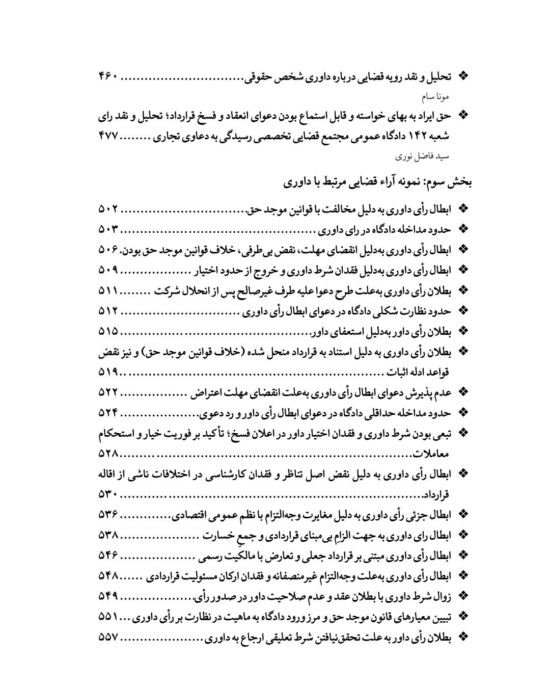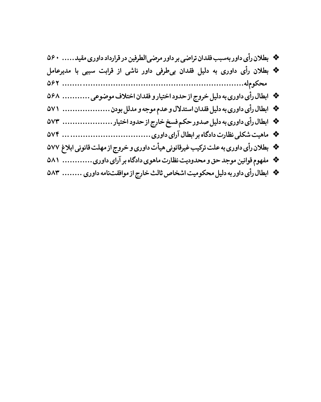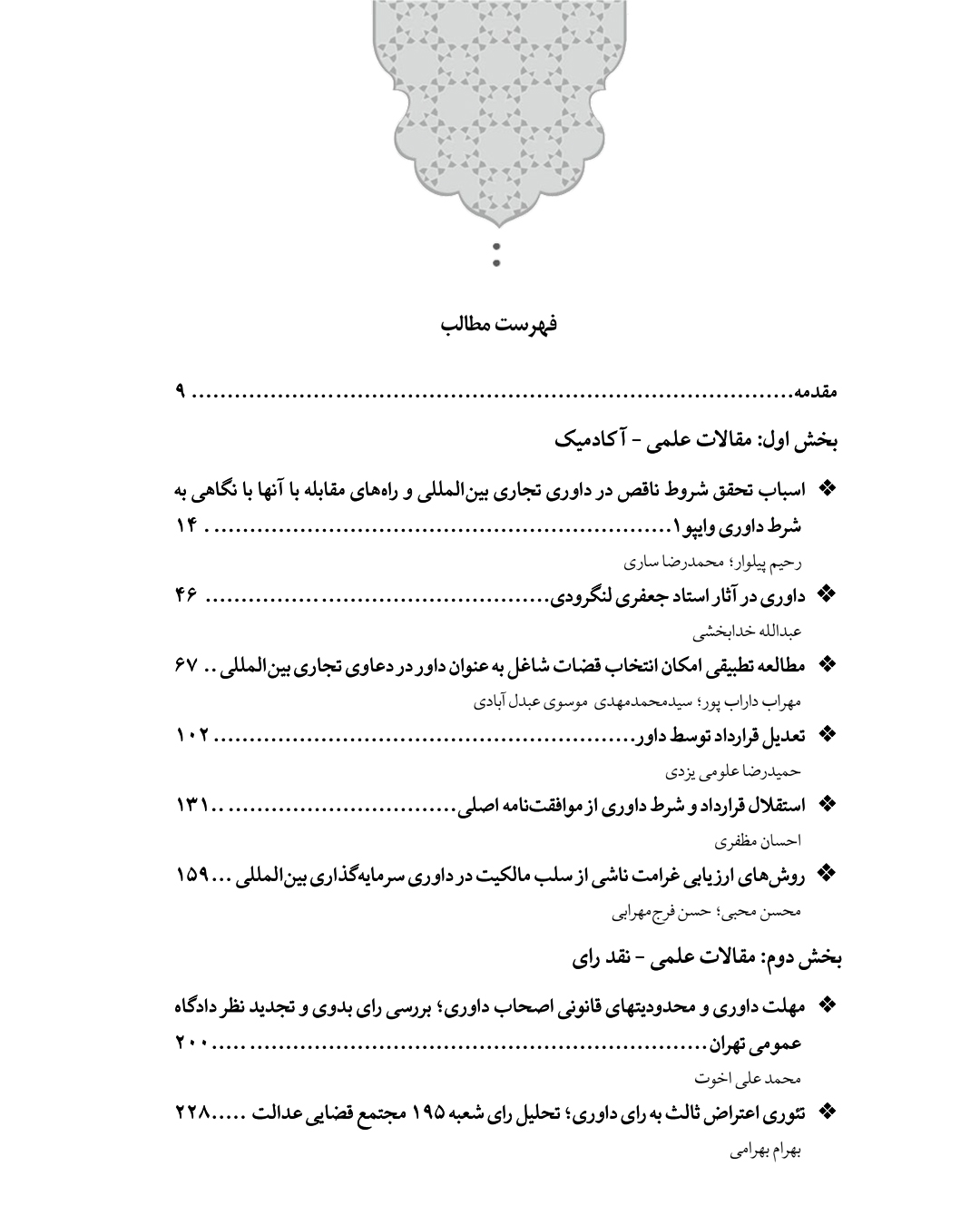 ساختار کتاب در سه بخش سامان یافته است: بخش نخست به مبانی نظری و اصول بنیادین داوری می پردازد و مباحثی از آن را در نظام حقوقی ایران و در پرتو قواعد بین‌المللی بررسی می کند. بخش دوم شامل مقالات تحلیلی و انتقادی درباره آراء قضایی است و ارتباط میان قانون، تفسیر قضایی و اجرای عملی نهاد داوری را واکاوی می کند. بخش سوم گزیده ای از آراء محاکم در موضوع داوری را گردآوری کرده است تا امکان بهره‌گیری مستقیم از متون قضایی برای پژوهش‌های علمی و مطالعات تطبیقی فراهم گردد.
